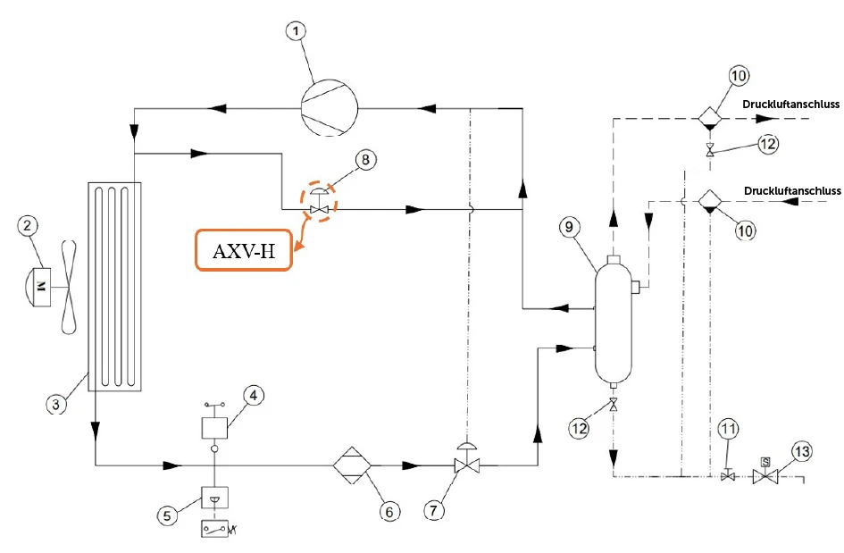 1. Kompressor 2. Lüftermotor 3. Kondensator 4. Lüfterschalter 5. Hochdruckschalter 6. Trockner 7. Expansionsventil 8. Heißgas-Bypassventil 9. Wärmetauscher 10. Filter 11. Entwässerung 12. Rückschlagventil 13. Magnetventil