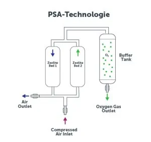 The regeneration process begins with a reduction in tank pressure; nitrogen and other gas molecules trapped on the zeolite surface are expelled. This reactivates the granules, preparing them for oxygen production in the next cycle. This reciprocating system ensures an uninterrupted, reliable, and continuous flow of oxygen. PSA technology has the capacity to produce oxygen with 90–95% purity when implemented in a properly designed system.